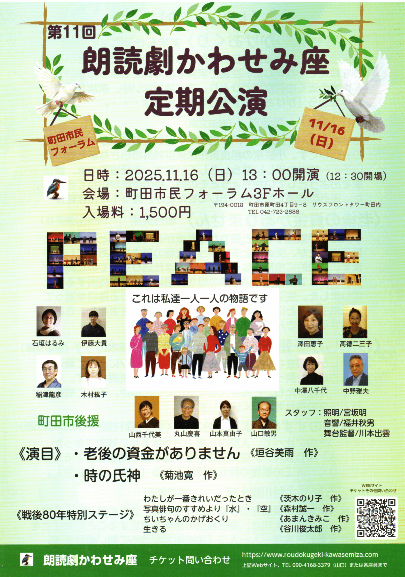 - 第11回朗読劇かわせみ座定期公演の日が近付いてきました。多くのお客様にご観覧いただきたいと願っていましたがお陰様でチケットは完売しました。事務局は嬉しい悲鳴を上げています。11月16日(日)13時開演(開場は12時半)、町田市民フォーラムでお会い致しましょう!